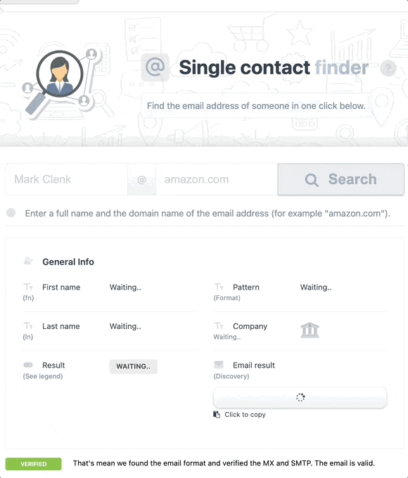 You will be able to upload a CSV with this information: first name, last name, and company name (or domain). Once you upload the data, the tool will try to find the email of each contact from the email format (for example, [email protected]). This tool is perfect for discovering emails from a list of business data.